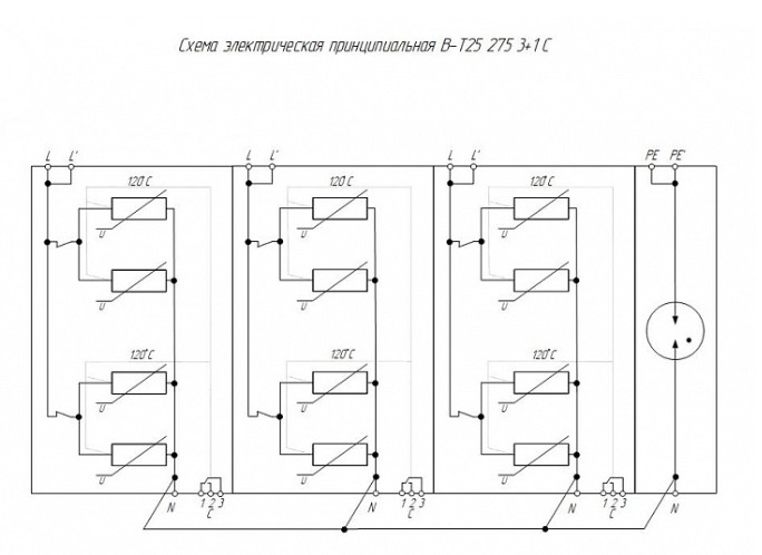 В-Т25 275/3+1 С, ТУ 3428-002-79740390-2007 – четырёхполюсное УЗИП класса испытаний I+II на основе оксидно-цинковых варисторов и газонаполненного разрядника.