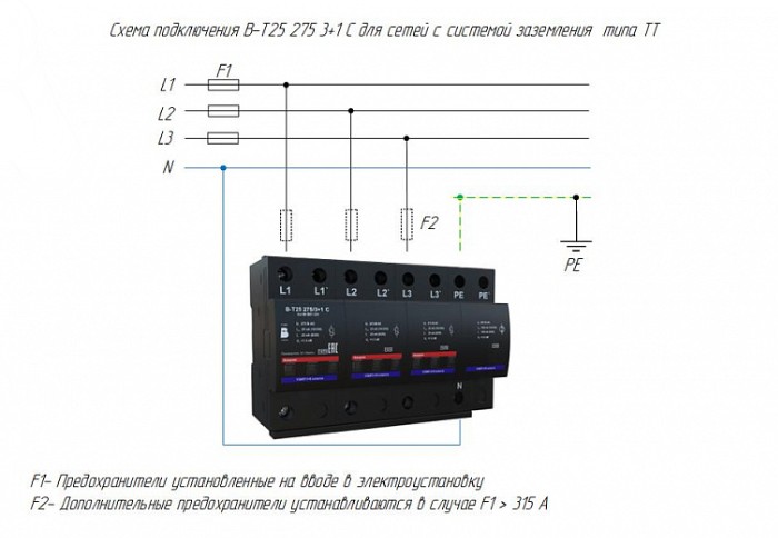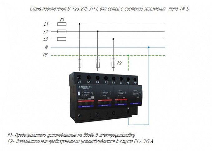 Устройство В-Т25 275/3+1 С, ТУ 3428-002-79740390-2007 по способности выдерживать токовые нагрузки соответствует УЗИП класса испытаний I, согласно ГОСТ IEC 61643-11, а по ограничению переходных напряжений допустимых для оборудования Up – УЗИП класса испытаний II. Устанавливается в пределах 0А(В) - 1 зон молниезащиты (в соответствии с ГОСТ Р МЭК 62305-1 и СО-153-34.21.122). Предназначено для защиты оборудования в низковольтных силовых распределительных системах до 1000 В при воздушном или кабельном вводе электропитания.
