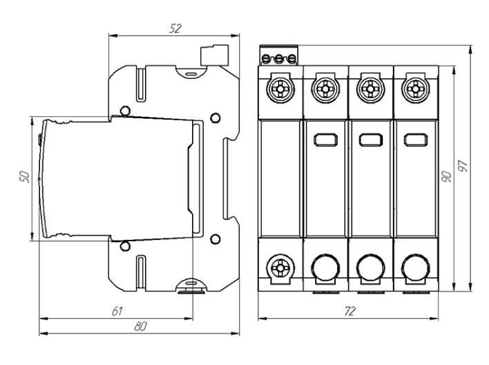 Состоит из сменных варисторных модулей, модуля с разрядником и базы для подключения к сети и креплению к DIN-рейке 35 мм.