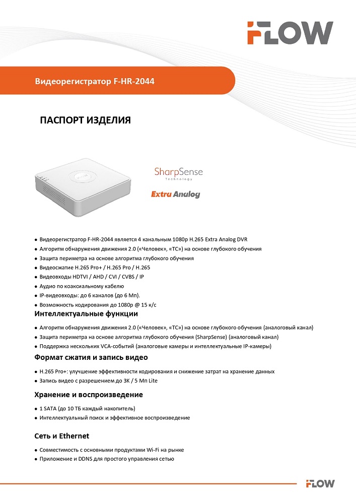 F-HR-2044 4-х канальный гибридный HD-TVI регистратор c технологией SharpSense и AoC iFlow; запись: TVI: 3Мп@12к/с (1й канал); 4Мп Lite, 1080p@15к/с, 1080p Lite /720p Lite /720p@25к/с; аналоговые камеры: WD1@25к/с; IP: до 6Мп - входящий битрейт 72Мб/с; 4 канала BNC; 1 канал RCA, (4 канала AoC); 1 VGA и 1 HDMI до 1080Р; H.265 Pro/ H.265/ H.265+/ H.264/ H.264+; аудиосжатие G.711u., обнаружение движения 2.0, 1 SATA для HDD до 10Тб; 1 RJ-45 10M/ 100M Ethernet интерфейс; 2 USB2.0; -10°C до +55°C; 12В DC: 18Вт макс (без HDD).,пластик, блок питания в комплекте.