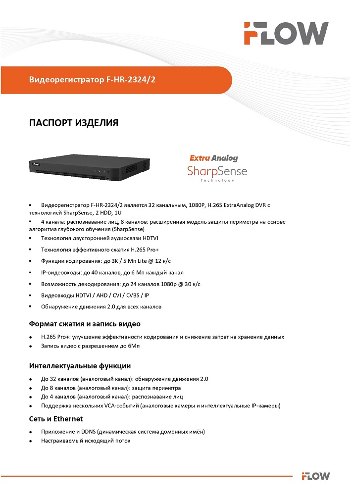 Видеорегистратор F-HR-2324/2 является 32 канальным, 1080P, H.265 ExtraAnalog DVR с технологией SharpSense, 2 HDD, 1U