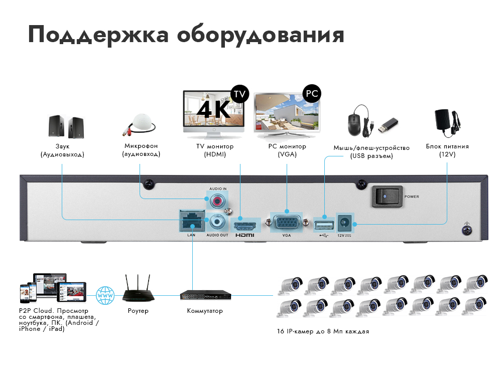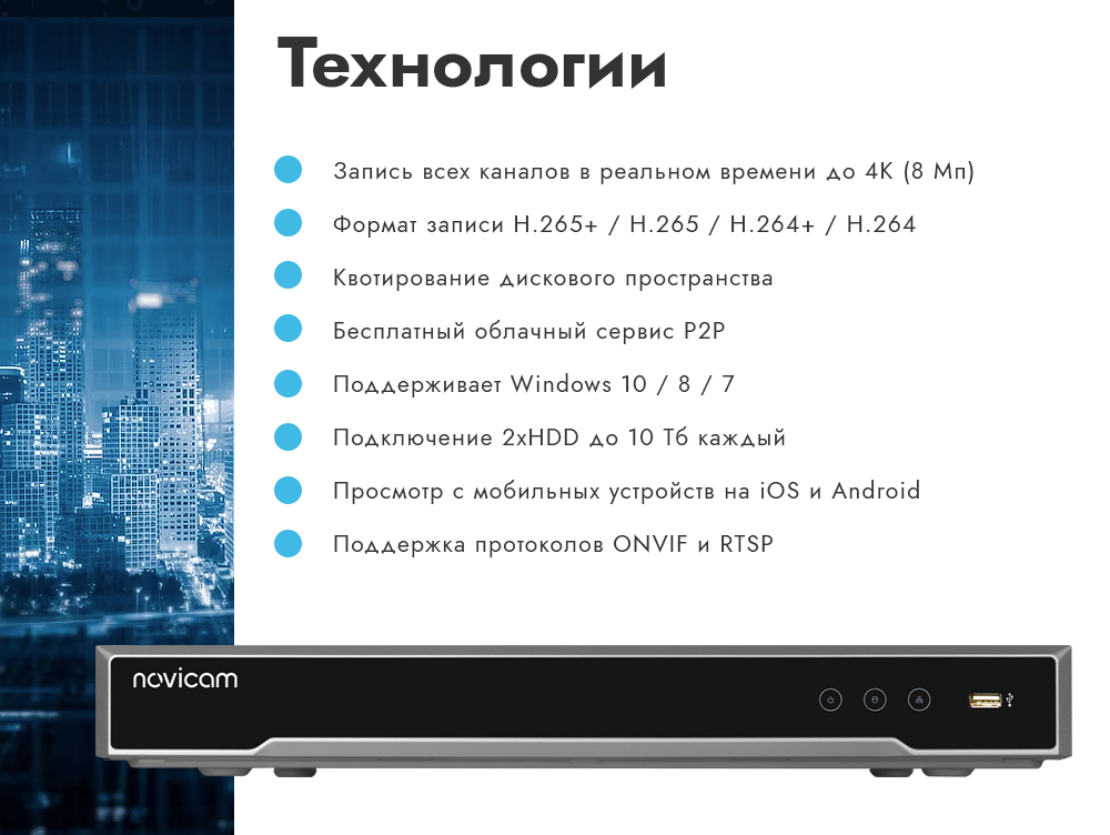 Автоматический помощник позволит легко подключить IP камеры. Возможность удалённого одновременного подключения до 32 пользователей в сочетании с выходным потоком в 80 Мбит/с и облачный сервис P2P, позволяют легко подключиться к видеорегистратору любым пользователям, где бы они не находились. Обладает совместимостью со всем оборудованием линейки Novicam.