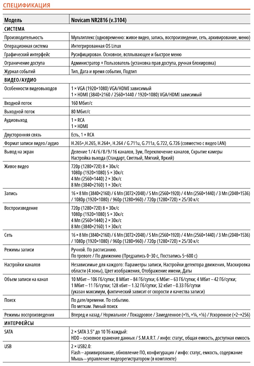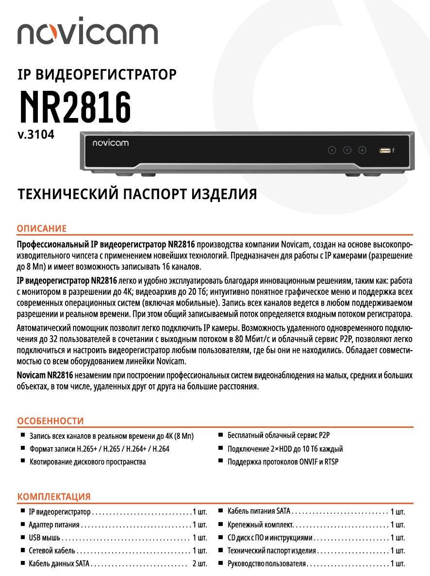 NR2816 (ver.3104) IP-видеорегистратор 16-ти канальный NOVIcam; 16х8 Mpix (3840x2160) / 6 Mpix (3072х2048) / 5 Mpix (2560x1920) / 4 Mpix (2560х1440) / 3 Mpix (2048х1536) / 1080p (1920х1080) / 960p (1280x960) / 720р (1280х720) x 25/30 к/с; 2xSATA 3,5" до 10Тб каждый; 1х кулер; H.265+/H.265/H.264+/H.264; Р2Р; 1 x RCA; -10°C ~ +55°C; 385x52x315 мм.