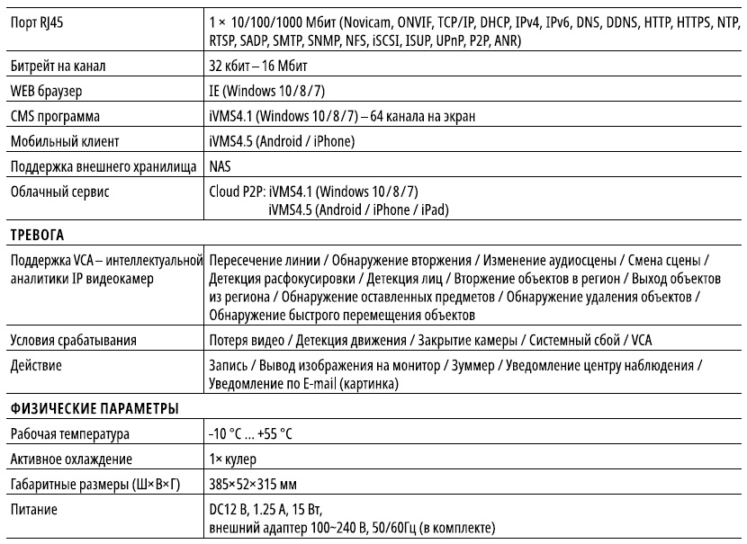 Порт RJ45 1х10/100/1000Мбит (Novicam, ONVIF, TCP/IP, DHCP, IPv4, IPv6, DNS, DDNS, HTTP, HTTPS, NTP, RTSP, SADP, SMTP, SNMP, NFS, iSCSI, ISUP, UPnP, P2P, ANR)