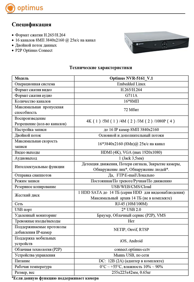 Сетевой видеорегистратор Optimus NVR-5161_V.1 сочетает высокопроизводительный процессор обработки видеоданных и встроенную операционную систему Embedded Linux.