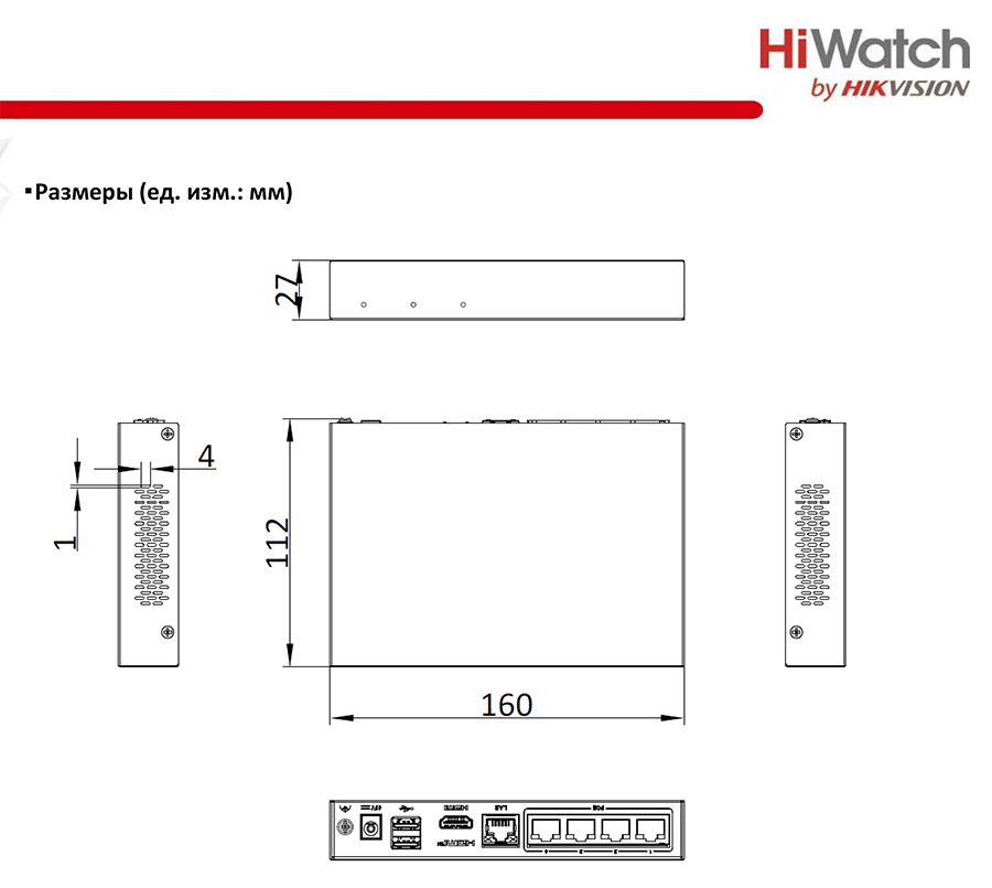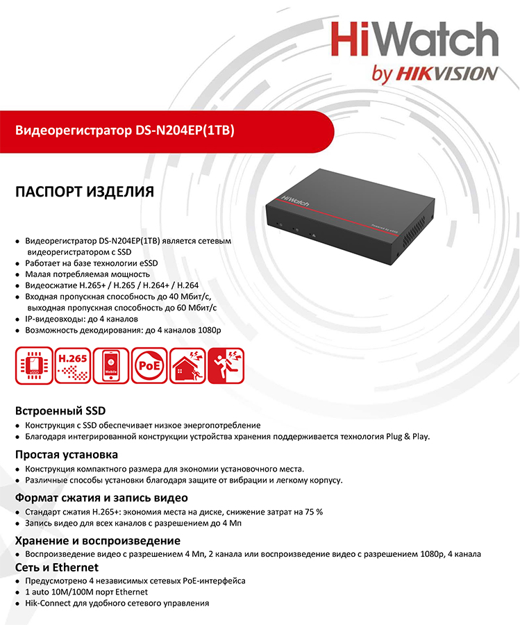 DS-N204EP(1TB) IP-видеорегистратор 4-канальный HiWatch; 4 Мп/3 Мп/1080p/UXGA/720p/VGA/4CIF/DCIF/2CIF/CIF/QCIF; 4, RJ45 auto 10/100M Ethernet; входящий поток 40 Мб/с; исходящий поток 60 Мб/с; H.265, Smart 265, H.264, Smart 264; 1 встроенный SSD, 1 ТБ; 2xUSB 2.0; DC 48 В, 1.04 A; -10...+55°C; 160x112x27 мм; 0.5 кг.