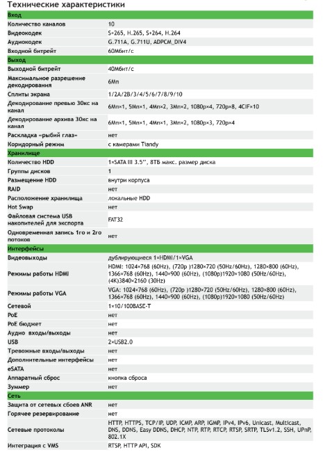 TC-R3110 Spec:I/B/L/Eu/V1.1 IP видеорегистратор 10-ти канальный Tiandy; входной/выходной битрейт 40/40 Мбит/c; S+265/H.265/H.264; 1 SATA до 8 ТБ; HDMI , VGA; USBх2; 1хRJ45 10M/100M Ethernet; ONVIF; DC12V 1.5A; -10°C...+55°C; 42.9х200х199.5 мм; 0.4 кг.