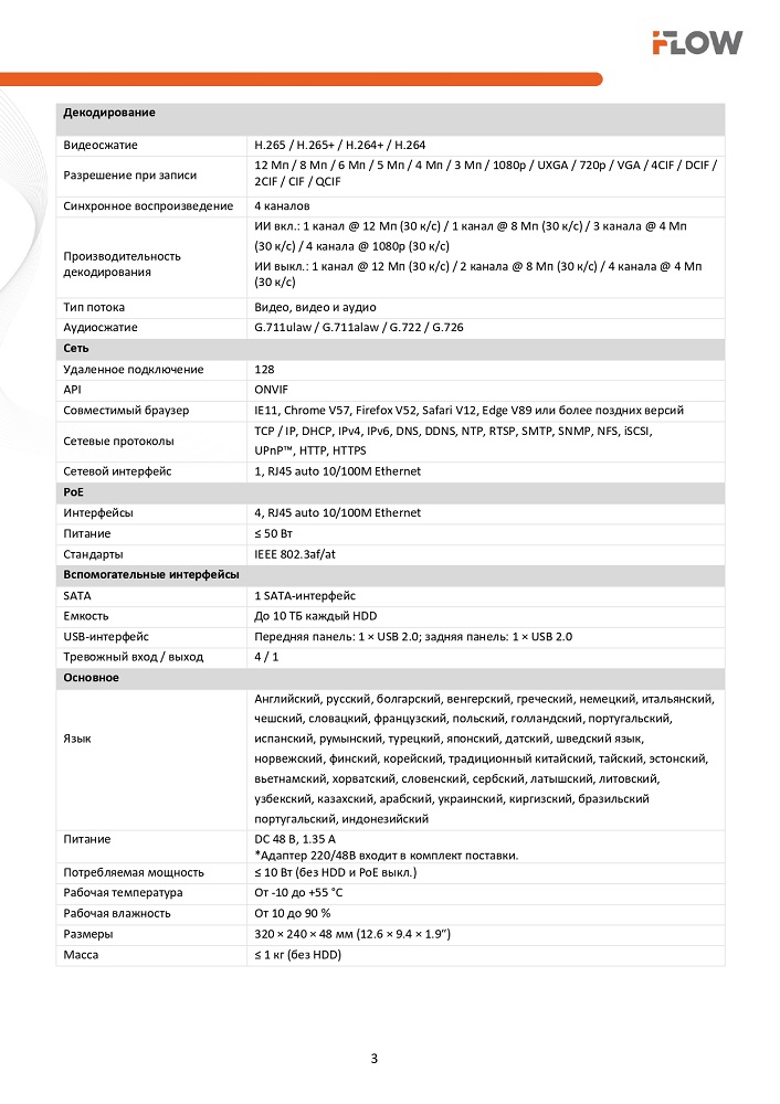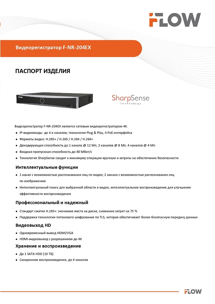 F-NR-204EX 4-х канальный IP-регистратор c 4-мя PoE интерфейсами и технологией SharpSense iFlow; 4 IP@12Мп; 1 канал RCA; 1 VGA до 1080p, 1 HDMI до 4К; H.265+/ H.265/ H.264+/ H.264; входящий поток 40Мб/с; исходящий поток 80Мб/с; разрешение записи до 12Мп; синхр.воспр. 1 канал @12Мп, 1 канал @8Мп, 4 канала@4Мп; 1 SATA для HDD, до 10Тб каждый диск; 4 независимых PoE интерфейса 10/100M, IEEE 802.3 af/at, бюджет PoE 50Вт, поддержка режима передачи до 300м,10Мбит/с, CAT6; тревожные вход/выход 4/1, 1 10/100M Ethernet; 2 USB 2.0; -10°C...+55°C; DC48В; 60Вт макс (без HDD), ≤1 кг (без HDD), метал.