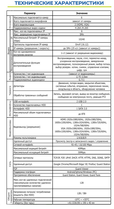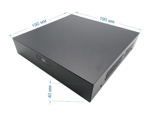 Видеорегистратор ST-NVR-V0605A45, Цифровой, режим работы:6 IP (5Mp), Всего видеовыходов: 2 (HDMI, VGA), HDMI:1920x1080/60Hz, 1920x1080/50Hz, 1600x1200/60Hz, 1280x1024/60Hz, 1280x720/60Hz, 1024x768/60Hz VGA:1920x1080/60Hz, 1920x1080/50Hz, 1600x1200/60Hz, 1280x1024/60Hz, 1280x720/60Hz, 1024x768/60Hz, Поддерживаемые видеокодеки: H.264/H.265, Поддерживаемые аудиокодеки: G.711, Запись IP камеры (разрешение / скорость): до 5Mp (25 к/с (зависит от камеры)), 1 HDD 1 SATA 3.0 до 8Тб, Сетевой интерфейс: RJ-45 / 10/100 Mbps, P2P: Guard Viewer, Поддержка платформ: Android/Iphone/Windows (PC), Напряжение питания/ потребляемая мощность (без HDD): 12В / 5Вт, Рабочая температура: -10°C ~ +55°C, Габариты, мм.: 190 х 190 х 40 мм.