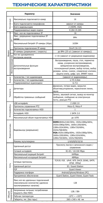 Видеорегистратор ST-NVR-V16081, Цифровой, режим работы:16 каналов до 8Mp,детектор движения,потери видео,закрытия объектива,вторжения,пересечения линии,звука, Всего видеовыходов: 2 (HDMI, VGA), HDMI:3840x2160/30Hz, 1920x1080p/60Hz, 1920x1080p/50Hz,1600x1200/60Hz, 1280x1024/60Hz, 1280x720/60Hz,1024x768/60Hz VGA:1920x1080p/60Hz, 1920x1080p/50Hz, 1600x1200/60Hz,1280х1024/60Hz, 1280х720/60Hz, 1024х768/60Hz, Поддерживаемые видеокодеки: H.264/H.265, Поддерживаемые аудиокодеки: G.711, Запись IP камеры (разрешение / скорость): до 8Mp (25 к/с (зависит от камеры)), 1 HDD SATA 3.0 до 10Тб, Сетевой интерфейс: RJ-45 / 10/100 Mbps, P2P: Guard Viewer, Поддержка платформ: Android/Iphone/Windows (PC), Напряжение питания/ потребляемая мощность (без HDD): 12В / 5Вт, Рабочая температура: -10°C ~ +55°C, Габариты, мм.: 260 х 240 х 46 мм.