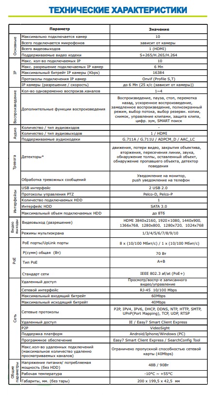 Видеорегистратор ST-NVR-P1006K15 (с 8PoE), Цифровой, режим работы:10 IP (6Mp), Всего видеовыходов: 1 (HDMI), HDMI 3840x2160, 1920×1080, 1440x900,1366x768,1280x800,1280x720,1024x768, Поддерживаемые видеокодеки: S+265/H.265/H.264, Поддерживаемые аудиокодеки: G.711A / G.711U / ADPCM_D / AAC_LC, Запись IP камеры (разрешение / скорость): до 6Mp (25 к/с (зависит от камеры)), 1 HDD SATA 3.0 до 8Тб, Сетевой интерфейс: RJ-45 10/100 Mbps, P2P: VideoSight, Поддержка платформ: Android/Iphone/Windows (PC), Напряжение питания/ потребляемая мощность (без HDD): 48В / 90Вт, Рабочая температура: -10°C ~ +55°C, Габариты, мм.: 200 х 199,5 х 42,5 мм.
