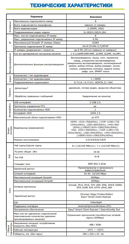 Видеорегистратор ST-NVR-P0806K15 (с 8РоЕ) TOWN, Цифровой, режим работы:8 IP (6Mp), Всего видеовыходов: 2 (HDMI, VGA), HDMI: 1024×768(60Hz), (720P )1280×720 (50Hz/60Hz), 1280×800(60Hz), 1440×900 (60Hz),(1080P)1920×1080(50Hz/60Hz) VGA: 1024×768(60Hz), (720P )1280×720 (50Hz/60Hz), 1280×800(60Hz), 1440×900(60Hz), (1080P)1920×1080(50Hz/60Hz), Поддерживаемые видеокодеки: S+265/H.265/H.264, Поддерживаемые аудиокодеки: G.711A / G.711U / ADPCM_D / AAC, Запись IP камеры (разрешение / скорость): до 6Mp (25 к/с (зависит от камеры)), 1 HDD SATA 3.5 до 8Тб, Сетевой интерфейс: RJ-45 10/100 Mbps, P2P: VideoSight, Поддержка платформ: Android/Iphone/Windows (PC), Напряжение питания/ потребляемая мощность (без HDD): 48В / 65Вт, Рабочая температура: -10°C ~ +55°C, Габариты, мм.: 200 х 200 х 43 мм.