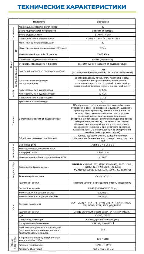 Видеорегистратор ST-NVR-V3212F97, цифровой, режим работы:32IP (12Mp) предназначен для обработки видео и аудио сигналов, поступающих от видеокамер систем охраны и микрофонов, с последующей записью на HDD, а также вывода изображения на экран монитора, Всего видеовыходов: 2 (HDMI, VGA), HDMI:4K (3840x2160), 4MP(2560x1440), 1920x1080p, 1280x1024, 1280x720, 1024x768 VGA:1920x1080p, 1280x1024, 1280x720, 1024x768, Поддерживаемые видеокодеки: H.264/H.264+/H.265/H.265+, Поддерживаемые аудиокодеки: G.711, Запись IP камеры (разрешение / скорость): до 12Мп (25 к/с (зависит от видеокамеры)), 2 HDD 2 SATA 3.0 до 10Тб, Сетевой интерфейс: RJ-45 (10/100/1000 Mbps), P2P: CV380, IPEYE, Поддержка платформ: Android/Iphone/Windows (PC), Напряжение питания/ потребляемая мощность (без HDD): 12В / 15Вт, Рабочая температура: -10°C ~ +55°C, Габариты, мм.: 380 х 316 х 51 мм.