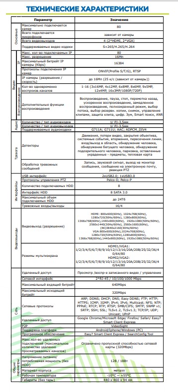 ST-NVR-V8016K15 80-канальный PRO TOWN IP-видеорегистратор Space Technology; S+265/H.265/H.264; G711A G711U AAC ADPCM_DIV4; Запись IP камеры (разрешение / скорость) до 16Мп (25 к/с (зависит от камеры); 8 HDD 8 SATA 3.0 до 24Тб; 2*RJ-45 / 10/100/1000 Mbps; 12В / 18Вт; -10°C ~ +55°C; 440 х 460 х 94 мм; 8,65 кг.