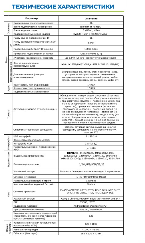 Видеорегистратор ST-NVR-V1612F95 PRO, цифровой, режим работы:16IP (12Mp) предназначен для обработки видео и аудио сигналов, поступающих от видеокамер систем охраны и микрофонов, с последующей записью на HDD, Всего видеовыходов: 2 (HDMI, VGA), HDMI:4K (3840x2160), 4MP(2560x1440), 1920x1080p, 1280x1024, 1280x720, 1024x768 VGA:1920x1080p, 1280x1024, 1280x720, 1024x768, Поддерживаемые видеокодеки: H.264/H.264+/H.265/H.265+, Поддерживаемые аудиокодеки: G.711, Запись IP камеры (разрешение / скорость): до 12Мп (25 к/с (зависит от видеокамеры)), 1 HDD 1 SATA 3.0 до 10Тб, Сетевой интерфейс: RJ-45 (10/100/1000 Mbps), P2P: CV380, IPEYE, Поддержка платформ: Android/Iphone/Windows (PC), Напряжение питания/ потребляемая мощность (без HDD): 12В / 10Вт, Рабочая температура: -10°C ~ +55°C, Габариты, мм.: 260 х 230 х 43 мм.