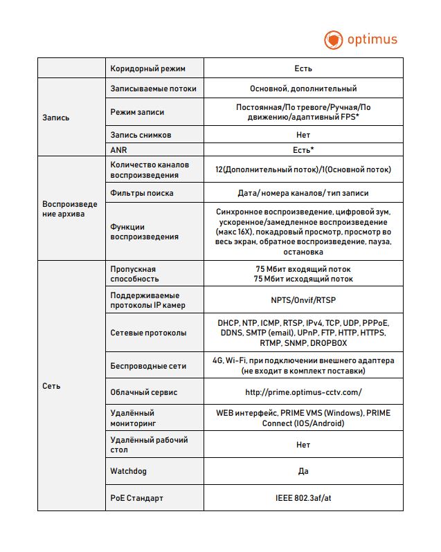 Максимальная пропускная способность составляет 75 Мбит (входящий и исходящий поток). Наилучшее качество отображения гарантируют выходы HDMI (Макс. 1920×1080) и VGA (Макс. 1920×1080). Возможность хранения данных обеспечивают форматы сжатия видео H.264 / H.265 / H.265+. Поддерживается функция ANR. Резервное копирование может производиться через USB, WEB-интерфейс, VMS. Видеорегистратор оснащён встроенным коммутатором с 8 PoE-портами (общий бюджет PoE 120 Вт, стандарт IEEE 802.3af/at) и 1 портом Uplink 100 Мбит/с. Режимы работы коммутатора: Default (стандартный) и AI + Auto 250m (автоматическое определение длины линии, активация Watchdog и переключение портов 1-8 в режим 250 м). Видеорегистратор обладает возможностями удаленного мониторинга: WEB-интерфейс, PRIME VMS (Windows), PRIME Connect (IOS/Android). Поддержка беспроводных сетей 4G и Wi-Fi при подключении внешнего адаптера (не входит в комплект поставки). Поддерживается облачный сервис prime.optimus-cctv.com. Есть поддержка коридорного режима камер и аудиоформата AAC.