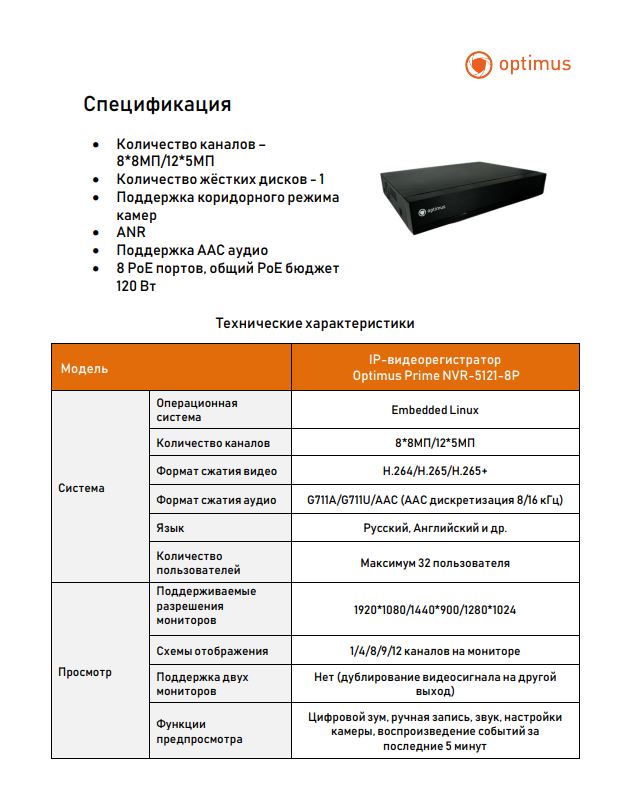 Сетевой видеорегистратор Optimus Prime NVR-5121-8P сочетает высокопроизводительный процессор обработки видеоданных и встроенную операционную систему Embedded Linux. Видеорегистратор имеет следующие режимы работы:Количество каналов – 8×8МП / 12×5МП