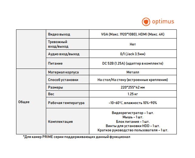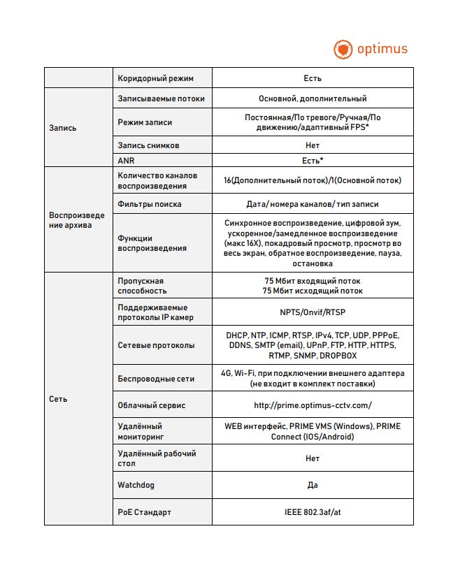 Максимальная пропускная способность составляет 75 Мбит (входящий и исходящий поток). Наилучшее качество отображения гарантируют выходы HDMI (Макс. 4K) и VGA (Макс. 1920×1080). Возможность хранения данных обеспечивают форматы сжатия видео H.264 / H.265 / H.265+. Поддерживается функция ANR. Резервное копирование может производиться через USB, WEB-интерфейс, VMS. Видеорегистратор оснащён встроенным коммутатором с 4 PoE-портами (общий бюджет PoE 60 Вт, стандарт IEEE 802.3af/at) и 1 портом Uplink 100 Мбит/с. Режимы работы коммутатора: Default (стандартный) и AI + Auto 250m (автоматическое определение длины линии, активация Watchdog и переключение портов 1-4 в режим 250 м). Видеорегистратор обладает возможностями удаленного мониторинга: WEB-интерфейс, PRIME VMS (Windows), PRIME Connect (IOS/Android). Поддержка беспроводных сетей 4G и Wi-Fi при подключении внешнего адаптера (не входит в комплект поставки). Поддерживается облачный сервис prime.optimus-cctv.com. Есть поддержка коридорного режима камер и аудиоформата AAC.