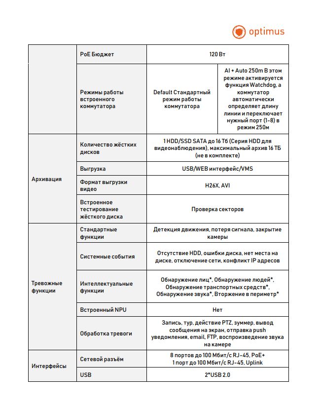 Максимальная пропускная способность составляет 75 Мбит (входящий и исходящий поток). Наилучшее качество отображения гарантируют выходы HDMI (Макс. 4K) и VGA (Макс. 1920×1080). Возможность хранения данных обеспечивают форматы сжатия видео H.264 / H.265 / H.265+. Поддерживается функция ANR. Резервное копирование может производиться через USB, WEB-интерфейс, VMS. Видеорегистратор оснащён встроенным коммутатором с 8 PoE-портами (общий бюджет PoE 120 Вт, стандарт IEEE 802.3af/at) и 1 портом Uplink 100 Мбит/с. Режимы работы коммутатора: Default (стандартный) и AI + Auto 250m (автоматическое определение длины линии, активация Watchdog и переключение портов 1-8 в режим 250 м). Видеорегистратор обладает возможностями удаленного мониторинга: WEB-интерфейс, PRIME VMS (Windows), PRIME Connect (IOS/Android). Поддержка беспроводных сетей 4G и Wi-Fi при подключении внешнего адаптера (не входит в комплект поставки). Поддерживается облачный сервис prime.optimus-cctv.com. Есть поддержка коридорного режима камер и аудиоформата AAC.