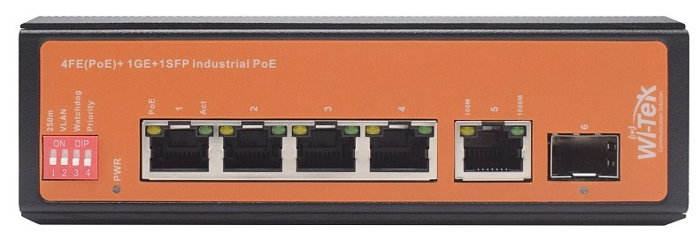 WI-PS206GF-I промышленный неуправляемый коммутатор Wi-Tek; предназначен для применения в индустриальных сетях предприятий; оснащен 4 портами 10/100Base-Т с поддержкой PoE 802.3at/af, 1 портом 1000Base-T, 1 портом 1000Base-X SFP; -40℃~80℃; 145*103*45 мм.