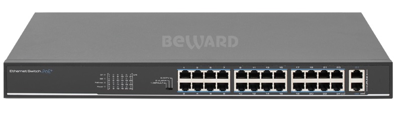 ST-2420HP коммутатор Beward; неуправляемый, 24 порта 10/100 Мбит/с (все с поддержкой High PoE) + 2 порта 10/100/1000 Мбит/с, PoE бюджет 225 Вт, CCTV режим до 250м; от -10 до +50°С; 440х44х180 мм; 2320 г.