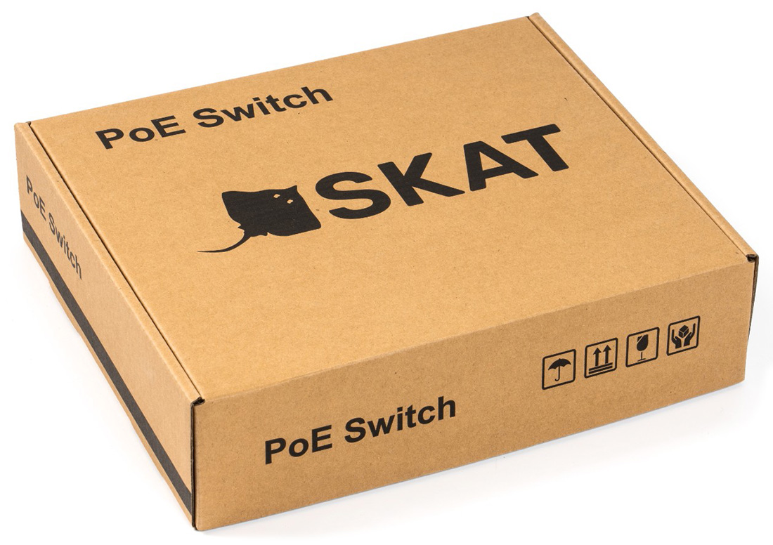 SKAT PoE-4E-1G неуправляемый коммутатор; 4 порта PoE; общая мощность 65 Вт; мощность на порт до 60 Вт; максимальная мощность на порт 30 Вт; грозозащита 3 кВ; 4хEthernet; 1хUplink; IEEE 802.3 af/at; 10…+55°С; 190х130х35 мм; 0,6 кг.