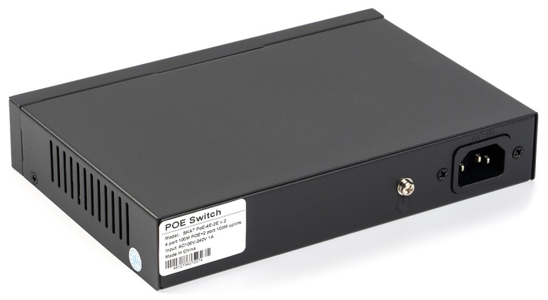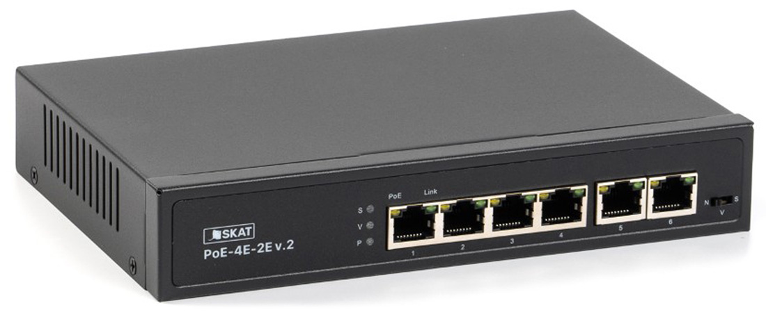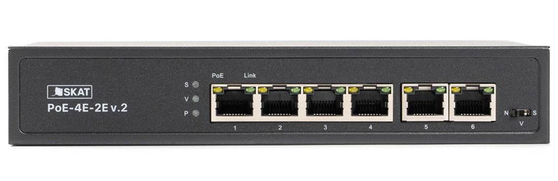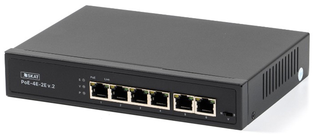 SKAT PoE-4E-2E v.2 представляет собой специализированный неуправляемый PoE коммутатор для использования в системах видеонаблюдения и безопасности. Характеризуется высокой надежностью работы благодаря защите от электростатических разрядов и перепадов напряжения, позволяет организовать качественную передачу информации в сети Ethernet.