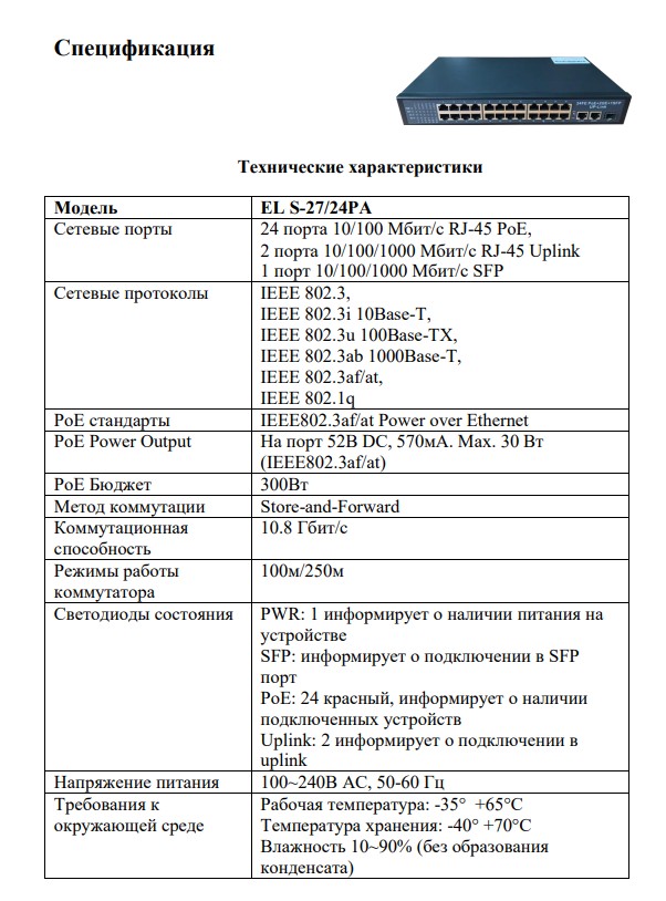 EL S-27/24PA 27 портовый PoE-коммутатор ; 24 порта 10/100 Мбит/с RJ-45 PoE; 2 порта 10/100/1000 Мбит/с RJ-45 Uplink; 1 порт 10/100/1000 Мбит/с SFP; IEEE802.3af/at/; 300Вт; -35°С...+65°C; 310x190x45 мм; 2 кг.