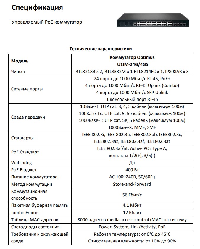 U1IM-24G/4GS управляемый L2 коммутатор 24 порта Optimus; 24 порта до 1000Mbps RJ-45; PoE 4 порта 100/1000Mbps RJ-45 Uplink (Combo); 4 порта 100/1000 Mbps SFP (Combo); 1 консольный порт RJ-45; IEEE 802.3af/at; 400 Вт; Watchdog; 440x290x44.5 мм; 3,4 кг.