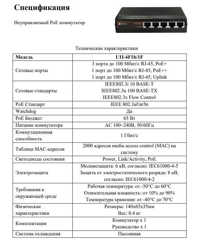 Коммутатор Optimus U1I-4F1b/1F - неуправляемый PoE-коммутатор. Он оснащен портами 10/100 Мбит/с с поддержкой PoE (технология передачи питания по сетевому кабелю вместе с данными) к каждому из которых можно подключать сетевые устройства (IP-камеры, IP-телефоны, беспроводные точки доступа).