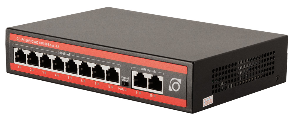 CB-POE08F2WD cетевой коммутатор; 10 портовый 10/100 Мбит/с с 8 портами РоЕ; IEEE 802.3 af/at; 5,6 Гбит/с; 120 Вт; металлический корпус; -20°С...+55°С.