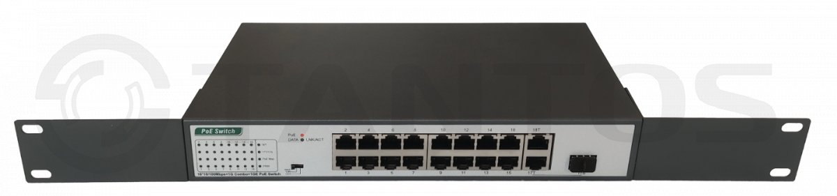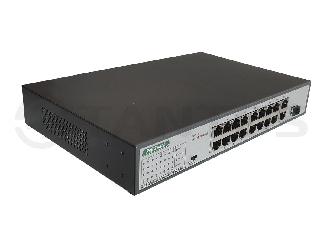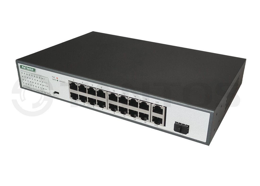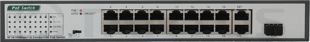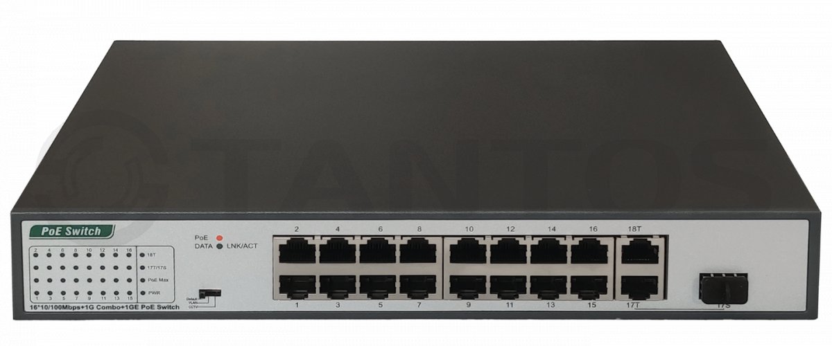 TSn-16P18U –это неуправляемый PoE-коммутатор с 16 портами RJ45 10/100 Мбит/с (с поддержкой PoE по стандарту 802.3 af/at), комбинированным (RJ45 и SFP) гигабитным портами.