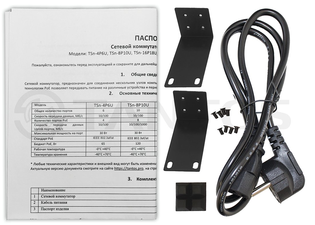 TSn-16P18U 18-ти портовый PoE-коммутатор Tantos; 1х10/100/1000Мбит/с RJ45 порт; IEEE802.3af/at; 16К MAC адресов; CCTV, VLAN; скорость пересылки пакетов 5.4 Mбит/с; пропускная способность 7.2 Гбит/с; 0°C...40°C; 280х180х44 мм; 1кг.