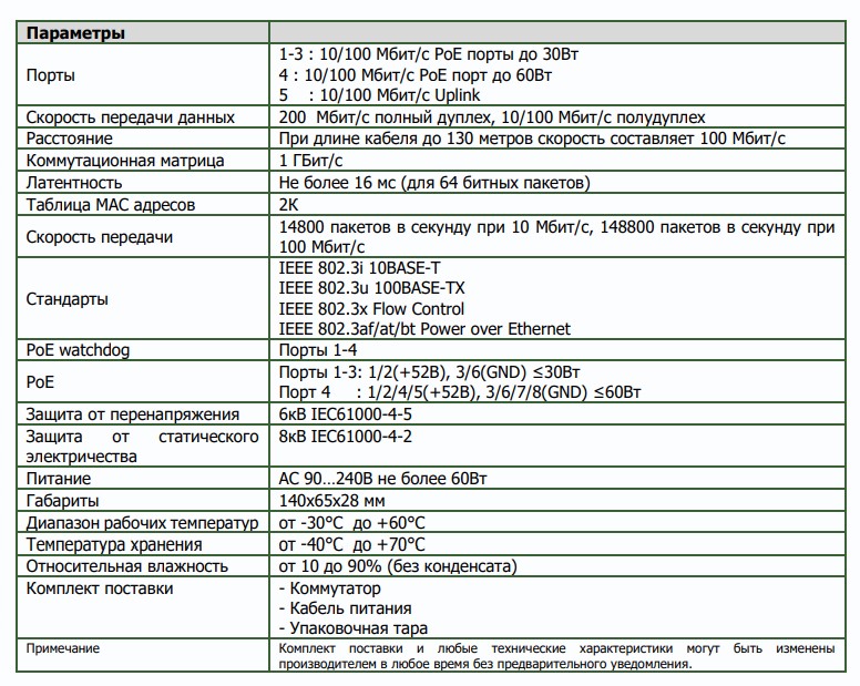 PoE коммутатор 4x100 Мбит/с PoE портов (3 порта 802.3af/at, максимальная мощность PoE 30Вт на порт, 1 порт 802.3af/at/bt, максимальная мощность PoE 60Вт на порт) + 100 Мбит/с порт Uplink, общий бюджет PoE 60 Вт, автоматический PoE watchdog, встроенный блок питания, грозозащита и защита от статического электричества, от -30°С до +60°С.