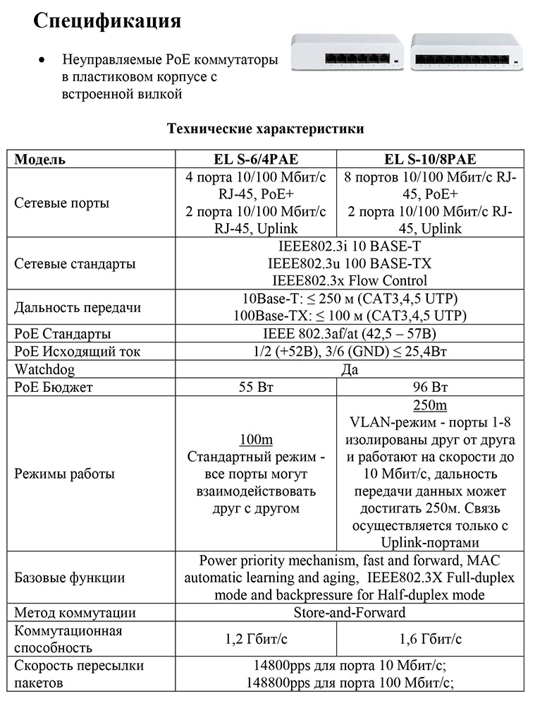 Коммутатор EL S-10/8PAE - это неуправляемый PoE-коммутатор в пластиковом корпусе и со встроенной вилкой питания. Он оснащен портами 10/100 Мбит/с с поддержкой PoE (технология передачи питания по сетевому кабелю вместе с данными), к каждому из которых можно подключать сетевые устройства (IP-камеры, IP-телефоны, беспроводные точки доступа).