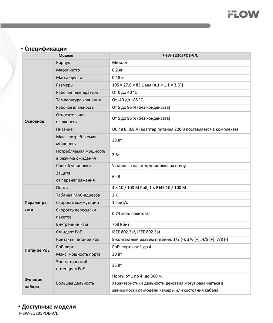 F-SW-EU205POE-V/L коммутатор L2 неуправляемый 4 порта iFlow; 4×10/100 М PoE, 1×RJ45 10/100 М; IEEE 802.3af, IEEE 802.3at; 35 Вт; 1 Гбит/с; 105х27.6х83.1 мм.