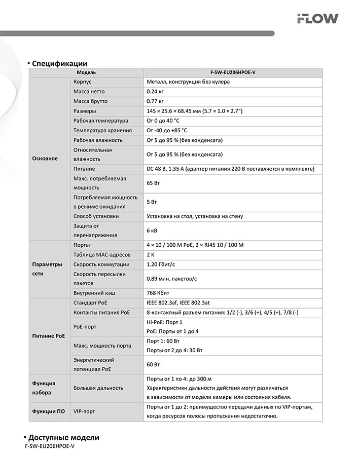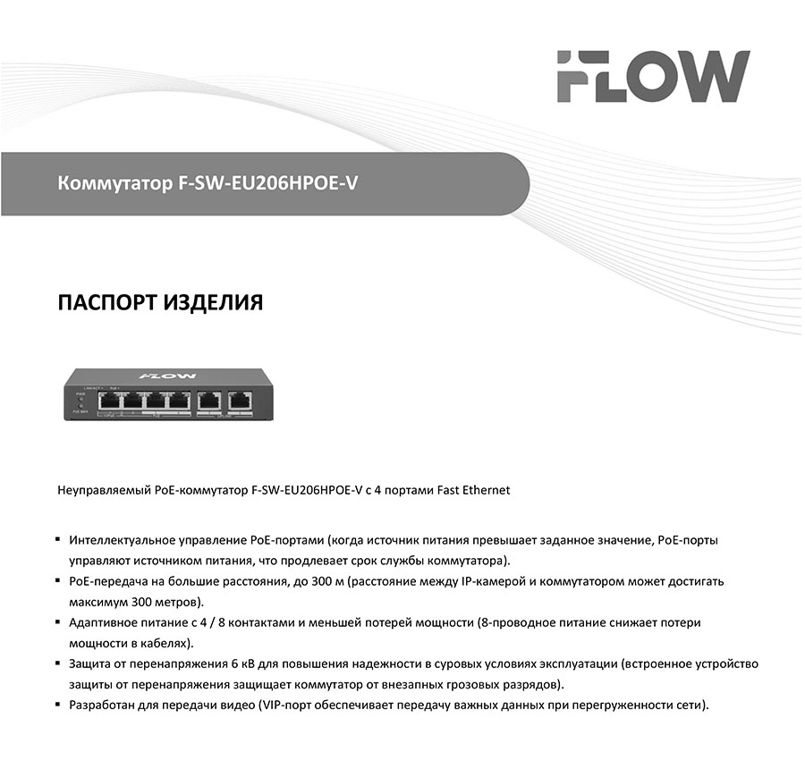 F-SW-EU206HPOE-V коммутатор L2 неуправляемый 4 порта iFlow; 4×10/100 М PoE, 1×RJ45 10/100 М; IEEE 802.3af, IEEE 802.3at; 60 Вт; 1.2 Гбит/с; металл; 145×25.6×68.45 мм.