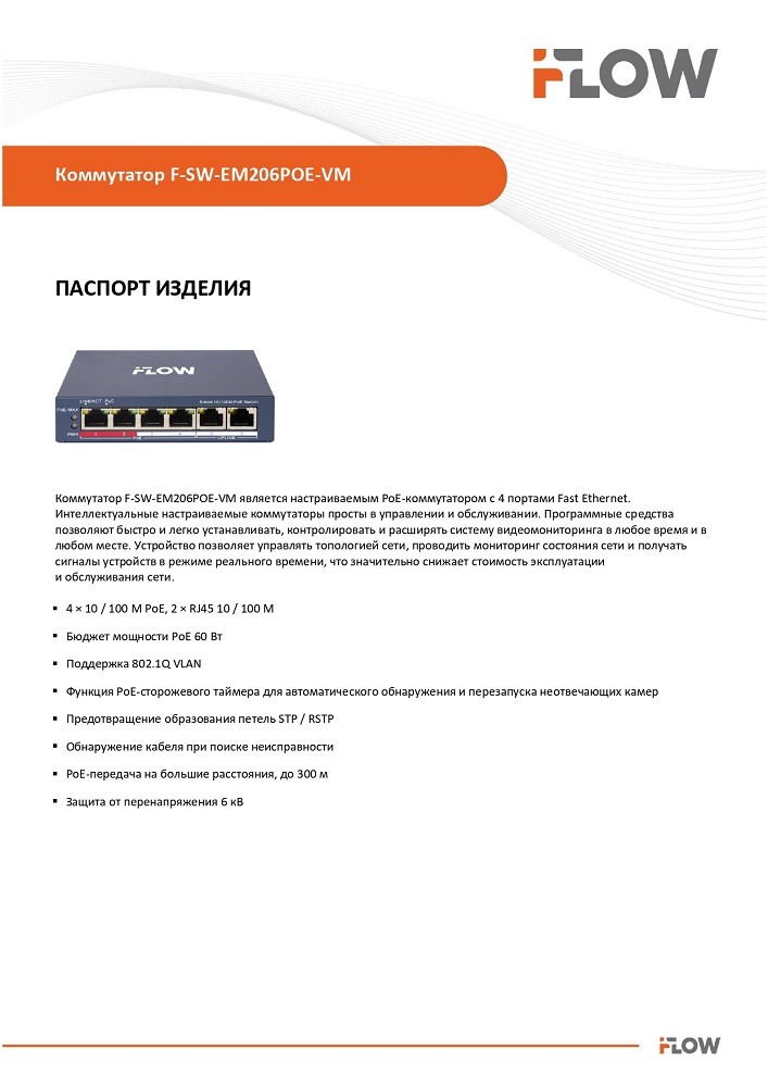 F-SW-EM206POE-VM Коммутатор L2, Смарт-управляемый, 4 порта 10/100M RJ45 PoE (iFlow); L2, Смарт-управляемый, 4 порта 10/100M RJ45 PoE, 2 uplink порта 10/100M RJ45, 802.3af/at, бюджет PoE 60 Вт, облачное управление, VLAN, STP/RSTP loop prefention, PoE watchdog, поддержка режима передачи до 300м,10Мб/с, CAT6; защита от перенапряжения 6 кВ; настольный/настенный монтаж; от 0 до 40 °C; 121.1 × 27.6 × 83.1 мм; 0,27кг.