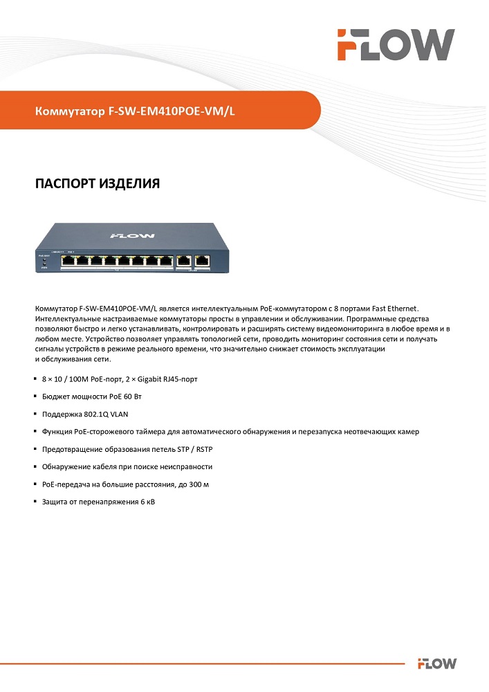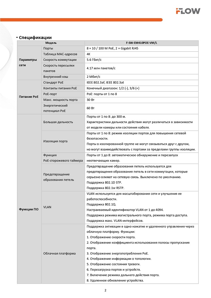 F-SW-EM410POE-VM/L коммутатор L2 8 портов iFlow L2, Смарт-управляемый, 8 портов 10/100M RJ45 PoE, 2 uplink порта 1000М RJ45, 802.3af/at, бюджет PoE 60 Вт, облачное управление, VLAN, STP/RSTP loop prefention, PoE watchdog, поддержка режима передачи до 300м,10Мб/с, CAT6; защита от перенапряжения 6 кВ; настольный/настенный монтаж; от 0 до 40 °C; 217.6 × 27.6 × 108.5мм; 0,54кг.