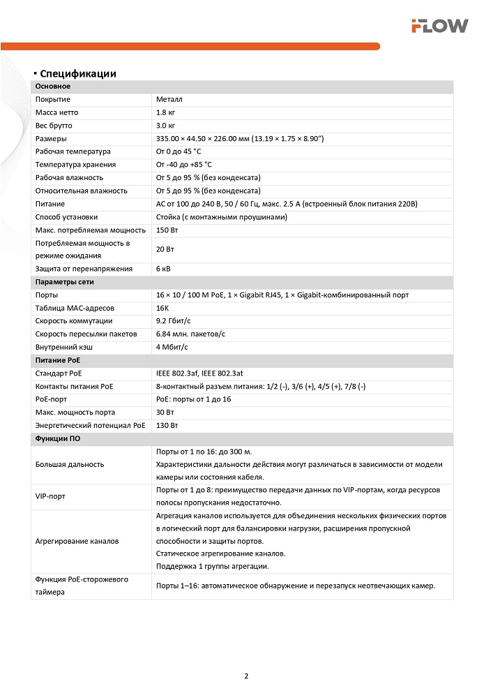 F-SW-EM418POE-VM/L коммутатор L2 16 портов iFlow; L2, Смарт-управляемый, 16 портов 10/100M RJ45 PoE, 1 uplink порт 1000М RJ45, 1 гигабитный комбо-порт, 802.3af/at, бюджет питания PoE 130 Вт, поддержка режима передачи до 300м,10Мб/с, CAT6; защита от перенапряжения 6 кВ; Поддержка унифицированного управления топологией, облачное управление, Rack mount; от 0 до 45 °C; 335 × 44.5 × 226 мм; 1,8 кг.