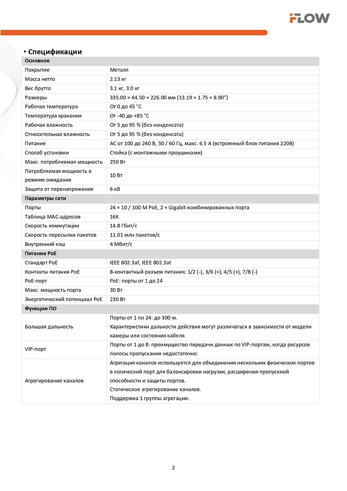 F-SW-EM426POE-VM/L Коммутатор L2, Смарт-управляемый, 24 порта 10/100M RJ45 PoE iFlow; L2, Смарт-управляемый, 24 порта 10/100M RJ45 PoE, 1 uplink порт 1000М RJ45 1 гигабитный комбо-порт, 802.3af/at, бюджет мощности PoE 230 Вт, поддержка режима передачи до 300м,10Мб/с, CAT6; защита от перенапряжения 6 кВ; Поддержка унифицированного управления топологией, облачное управление, Rack mount; от 0 до 45 °C; 335 × 44.5 × 226 мм; 2,13 кг.