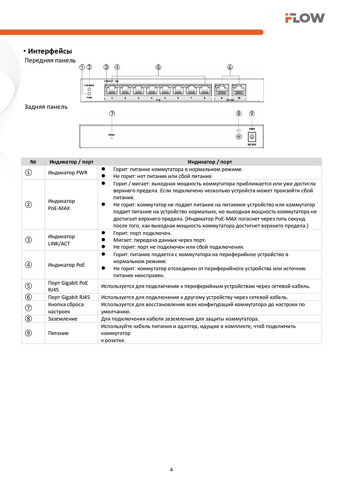 F-SW-EM610POE-VM/L коммутатор L2, Смарт-управляемый, 8 гигабитных портов RJ45 PoE iFlow; L2, Смарт-управляемый, 8 гигабитных портов RJ45 PoE, 2 uplink порта 1000М RJ45, 802.3af/at, бюджет мощности PoE 60 Вт, облачное управление, VLAN, STP/RSTP loop prefention, PoE watchdog, поддержка режима передачи до 300м,10Мб/с, CAT6; защита от перенапряжения 6 кВ; настольный/настенный монтаж; от 0 до 45 °C; 217.6 × 27.6 × 108.5мм; 0,54 кг.