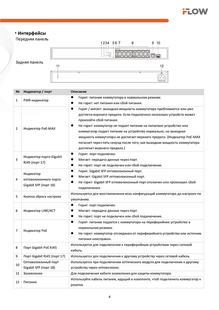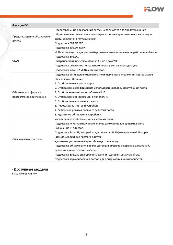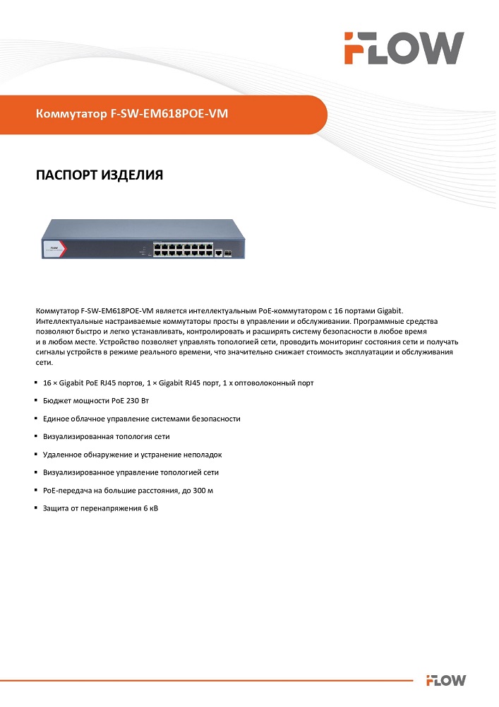 F-SW-EM618POE-VM коммутатор настраиваемый 16-ти портовый PoE-коммутатор iFlow; 16 × Gigabit PoE RJ45, 1 × Gigabit RJ45, 1 x оптоволоконный порт; 802.3af/at; бюджет PoE 230 Вт; облачное управление; VLAN; STP/RSTP loop prefention; PoE watchdog; поддержка режима передачи до 300м,10Мб/с; CAT6; защита от перенапряжения 6 кВ; 0..+45°C; 440х220.8х44.0 мм; 2,85 кг.