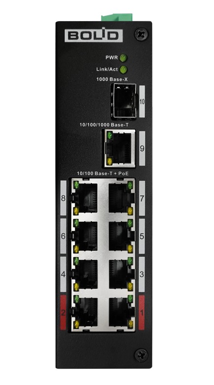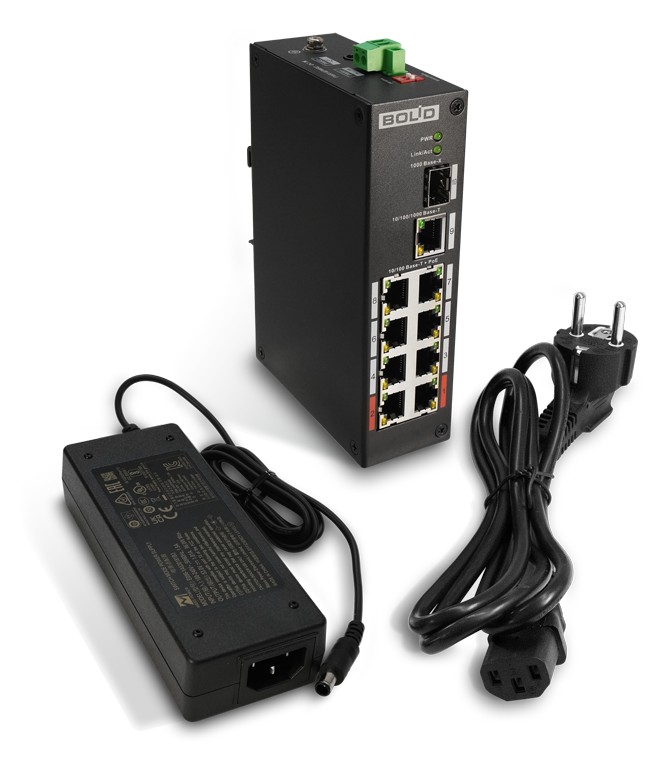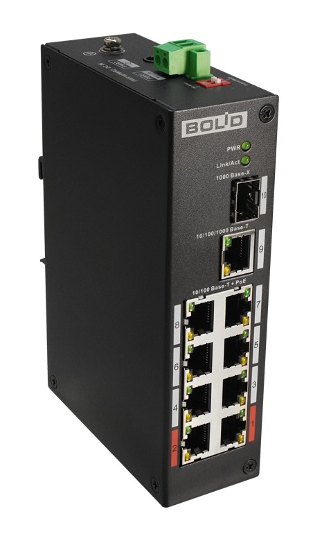 SW-108 коммутатор 8-портовый неуправляемый Болид; неуправляемый сетевой коммутатор 1 порт 1000 Base-X; 1 порт 10/1000 Мб/с Ethernet; 8 портов 10/100 Мб/с (PoE); 93 Вт; -30°C...+65°C; 150x100x42 мм; 0,57 кг.