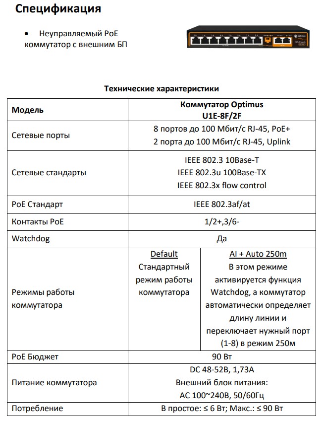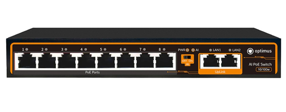 Коммутатор Optimus U1E-8F/2F - это неуправляемый PoE-коммутатор. Он оснащен портами 10/100 Мбит/с с поддержкой PoE (технология передачи питания по сетевому кабелю вместе с данными), к каждому из которых можно подключать сетевые устройства (IP-камеры, IP-телефоны, беспроводные точки доступа).