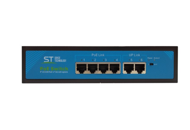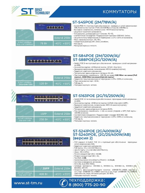 ST-S45POE (версия 4) сетевой PoE коммутатор Space Technology; 4хRJ45 PoE 10/100 Мбит/с; 2хRJ45 Uplink 10/100 Мбит/с; PoE бюджет до 65 Вт; дальность передачи до 250 метров, Vlan/Extend/QoS; внутренний БП AC 220В, кабель питания 220В и уголки крепления в стойку в комплекте; -45... +55°C; 200x170x44 мм; 0,95 кг.