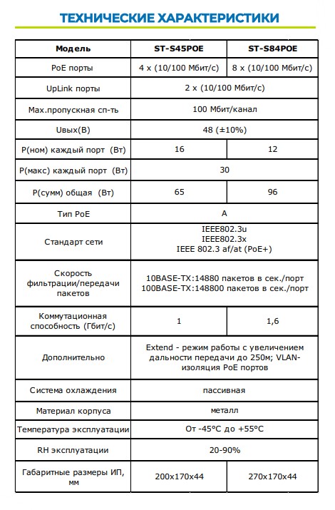 Источник питанияST-S45POE (2М/65W/А), Switch POE 4-х портовый,для обеспечения проводных сетей напряжением 48В, защита от КЗ, Extend 250м., VLAN, PoE порты: 4 х (10/100 Мбит/с), UpLink порты: 2 х (10/100 Мбит/с), Max.пропускная сп-ть: 100 Мбит/канал, Uвых: 48 (±10%), Р(ном) каждый порт (Вт): 16 Вт, Р(макс) каждый порт (Вт): 30 Вт, Р(сумм) общая (Вт): 65 Вт, Тип РоЕ: А, Коммутационная способность (Гбит/с): 1 Гбит/с, Extend - режим работы с увеличением дальности передачи до 250м VLANизоляция РоЕ портов, Система охлаждения: пассивная, Металл, Температура эксплуатации: От -45°C до +55°C, Габариты изделия, мм.: 200x170x44 мм.