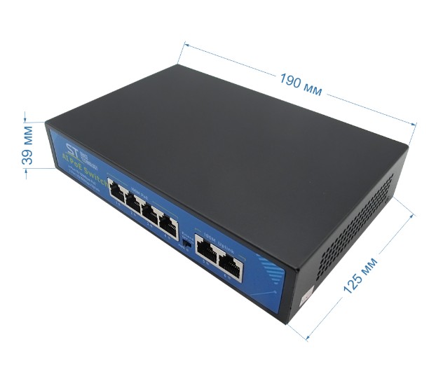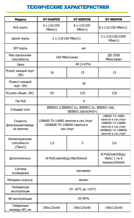 Источник питания ST-S46POE (2М/65W/А) PRO, (версия 4), Switch POE 4-х портовый для обеспечения проводных сетей напряжением 48В, защита от КЗ, Extend 250м., AI PoE, AI VLAN, Грозозащита, PoE порты: 4 х (10/100 Мбит/с), UpLink порты: 2 х (10/100 Мбит/с), SFP порты: нет, Max.пропускная сп-ть: 100 Мбит/канал, Uвых: 48 (±10%), Р(ном) каждый порт (Вт): 16 Вт, Р(макс) каждый порт (Вт): 30 Вт, Р(сумм) общая (Вт): 65 Вт, Тип РоЕ: А, Коммутационная способность (Гбит/с): 1,0 Гбит/с, AI PoE(watchdog)/Vlan/Extend, Система охлаждения: пассивная, Активное РОЕ Металл, Температура эксплуатации: От -45°C до +55°C, Габариты изделия, мм.: 190х125х40 мм.