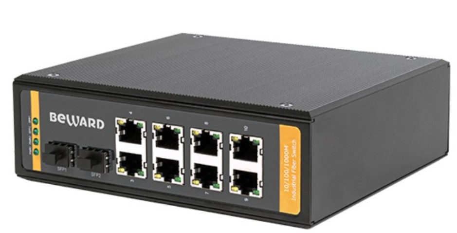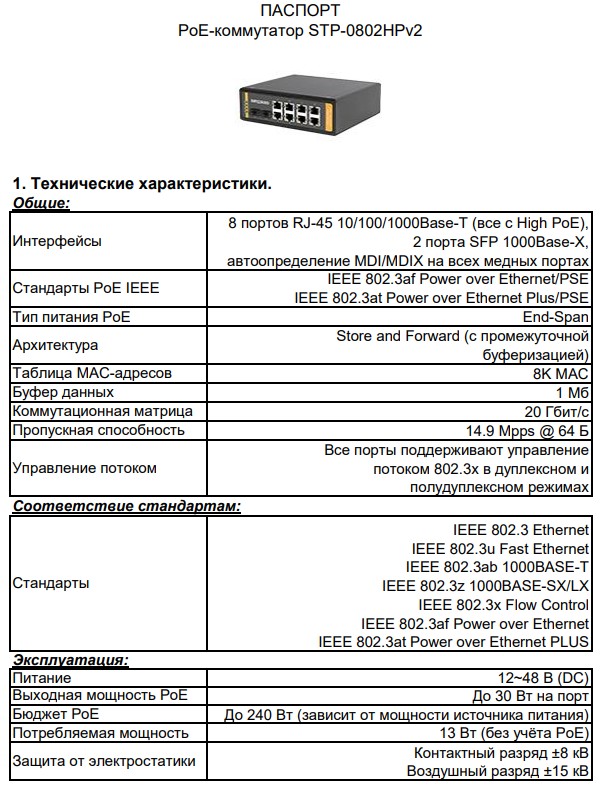STP-0802HPv2 неуправляемый PoE-коммутатор Beward; 8 гигабитных портов RJ-45 с поддержкой High PoE (30 Вт); 2 гигабитных порта SFP; IEEE 802.3af Power over Ethernet/PSE; IEEE 802.3at Power over Ethernet Plus/PSE; 14.9 Mpps @ 64 Б; 1632 Кбайт; потреб. мощность 13 Вт; от -40 до +85°С; 165х53х145 мм; 850 г.