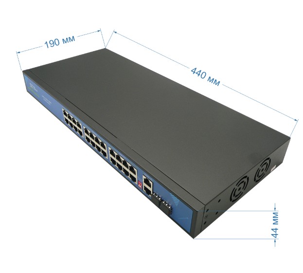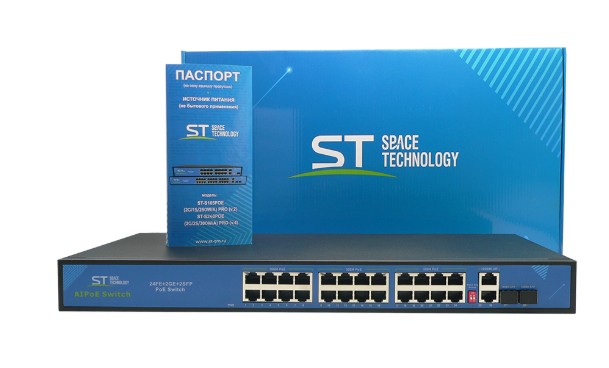 ST-S240POE (2G/2S/300W/А) PRO (версия 4) коммутатор на 24 PoE порта Space Technology; 24 х (10/100 Мбит/с), UpLink порты: 2 х(10/100/1000 Мбит/с), SFP порты: 2 х (10/100/1000 Мбит/с); 100 Мбит/канал (PoE порты); 1000Мбит/канал (UpLink и SFP порты); Uвых: 48 (±10%); от -45°C до +55°C; 440х190х45 мм.